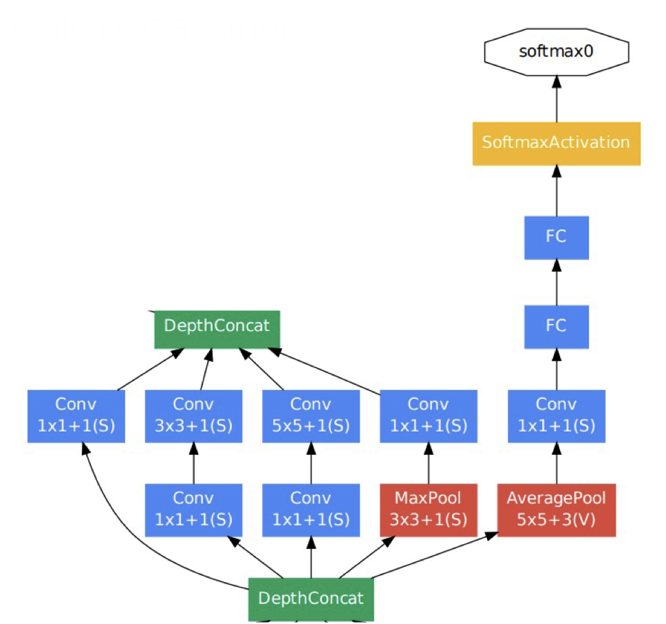 위 그림에서 Inception 모듈 옆에 달려있는 주사기 같은 것이 Auxiliary Classifier이다