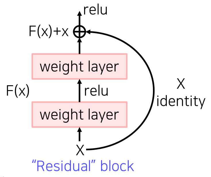 - Residual block (Skip Connection = Shortcut Connection) 이라는 것을 만들어 입력을 그대로 출력으로 보내자